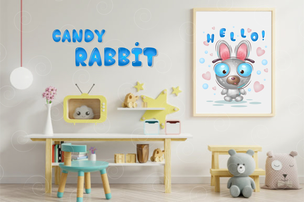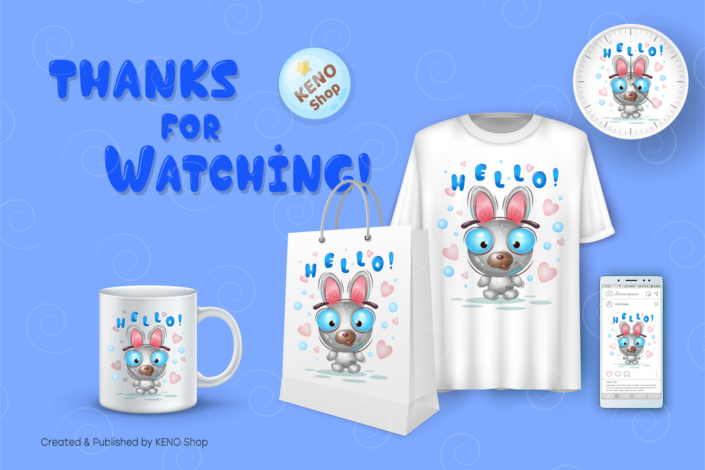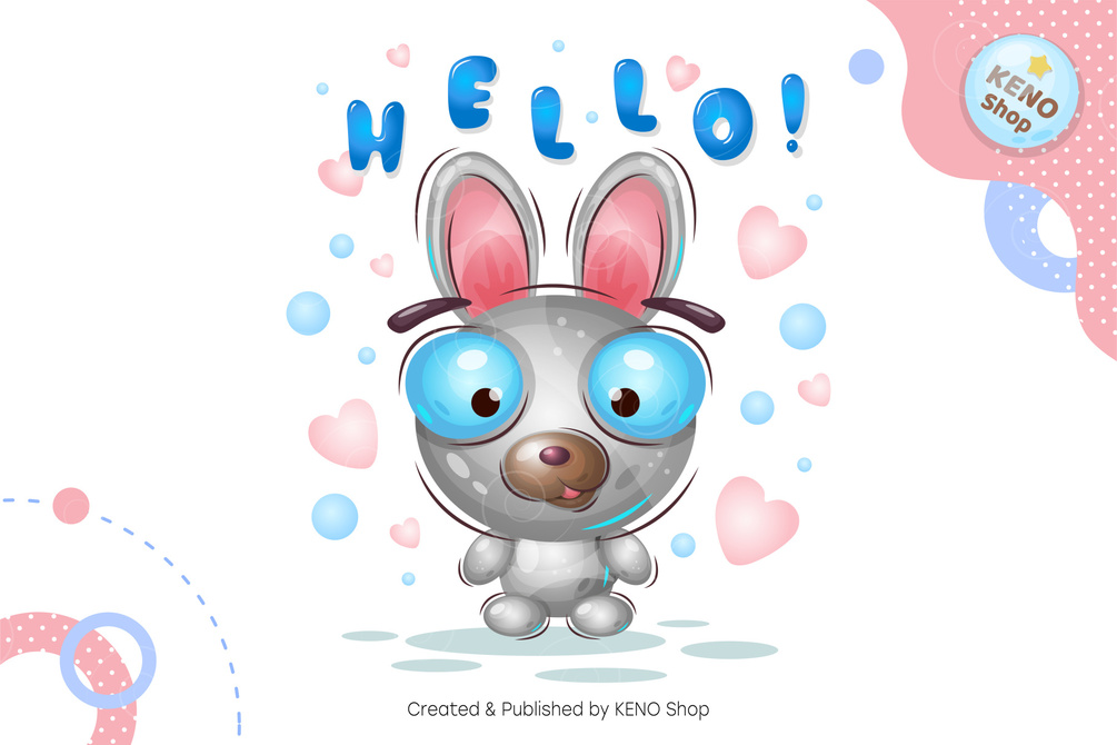 Cute cartoon rabbit is made in glaze style. Positive and unique design. Use the product for printing on clothing, accessories, party decorations, labels and stickers, kids room decoration, invitation cards, scrapbooking, kids crafts, diaries and more.