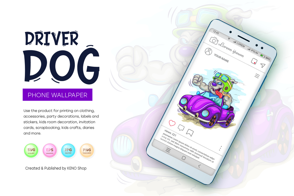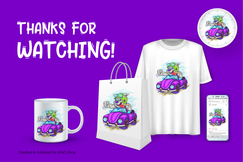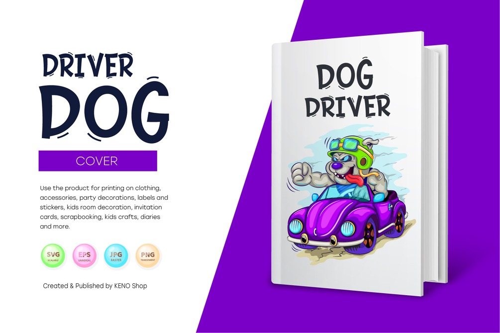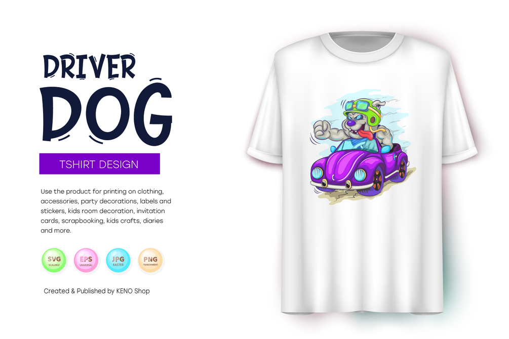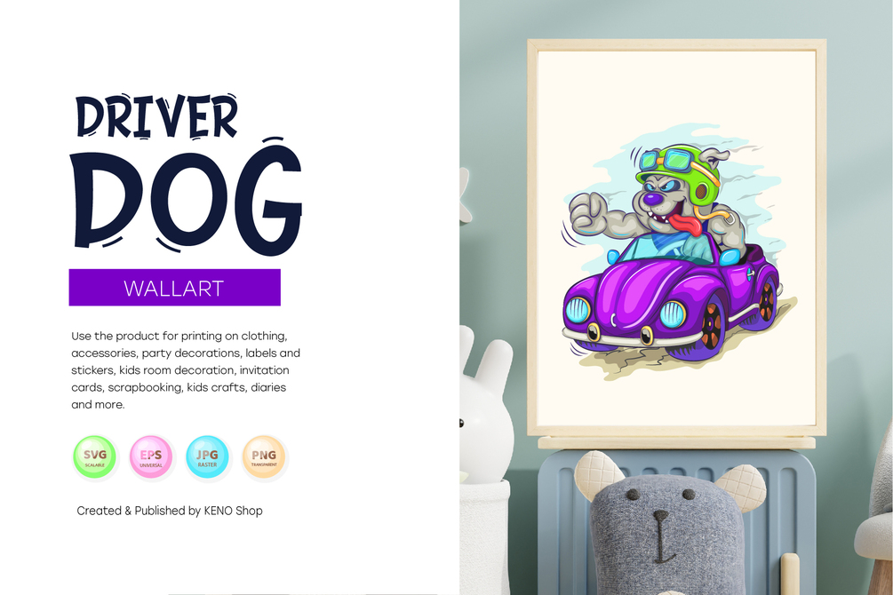 Colorful illustration of a dog driving a car. Children's bright illustration. Use the product for printing on clothing, accessories, party decorations, labels and stickers, kids room decoration, invitation cards, scrapbooking, kids crafts, diaries and more.