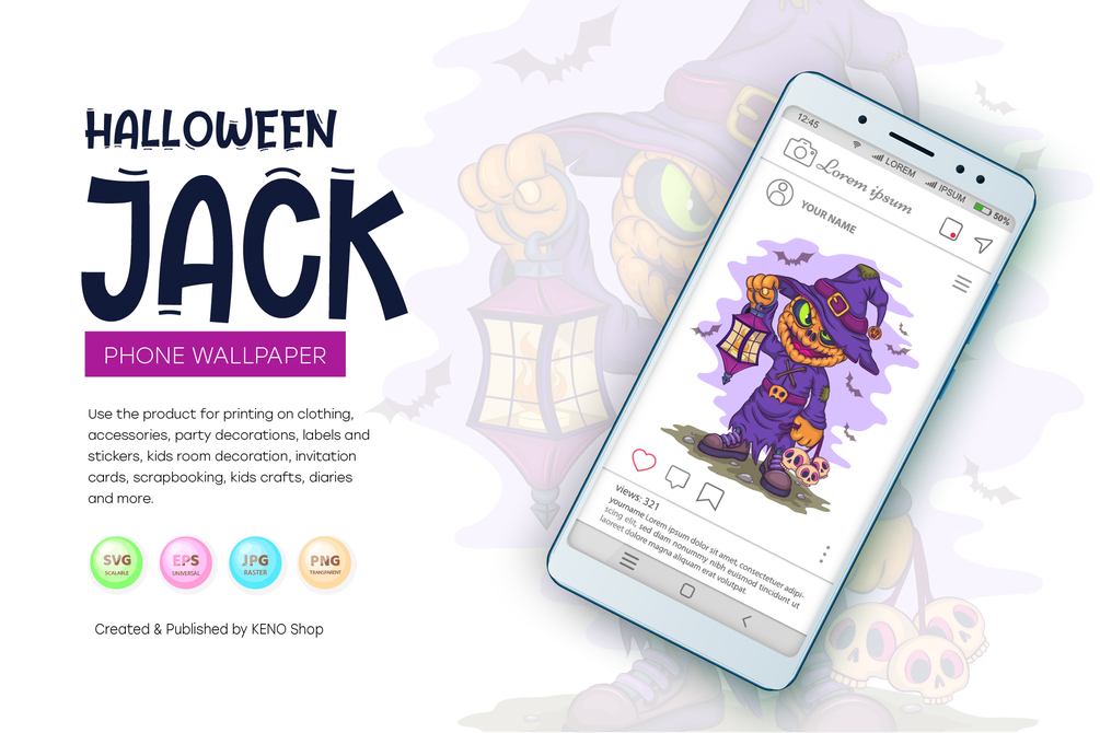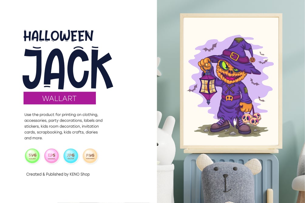 Cartoon Halloween Jack with a lantern and skulls. Halloween character. Unique design, Children's illustration. Use the product for printing on clothing, accessories, party decorations, labels and stickers, kids room decoration, invitation cards, scrapbooking, kids crafts, diaries and more.