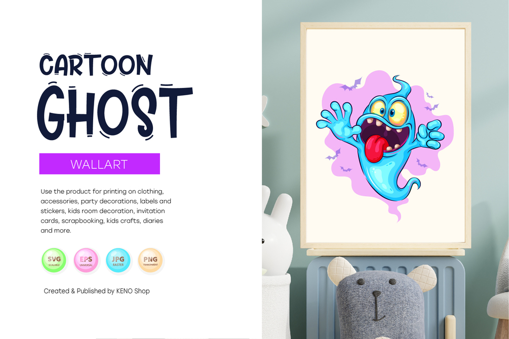 Illustration of a cute ghost for the holiday Halloween. Unique design, Children's illustration. Use the product for printing on clothing, accessories, party decorations, labels and stickers, kids room decoration, invitation cards, scrapbooking, kids crafts, diaries and more.