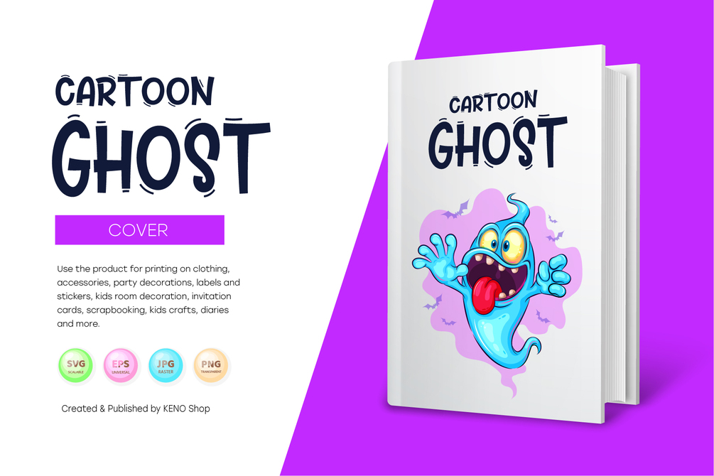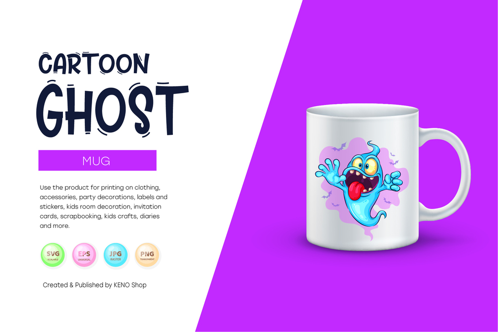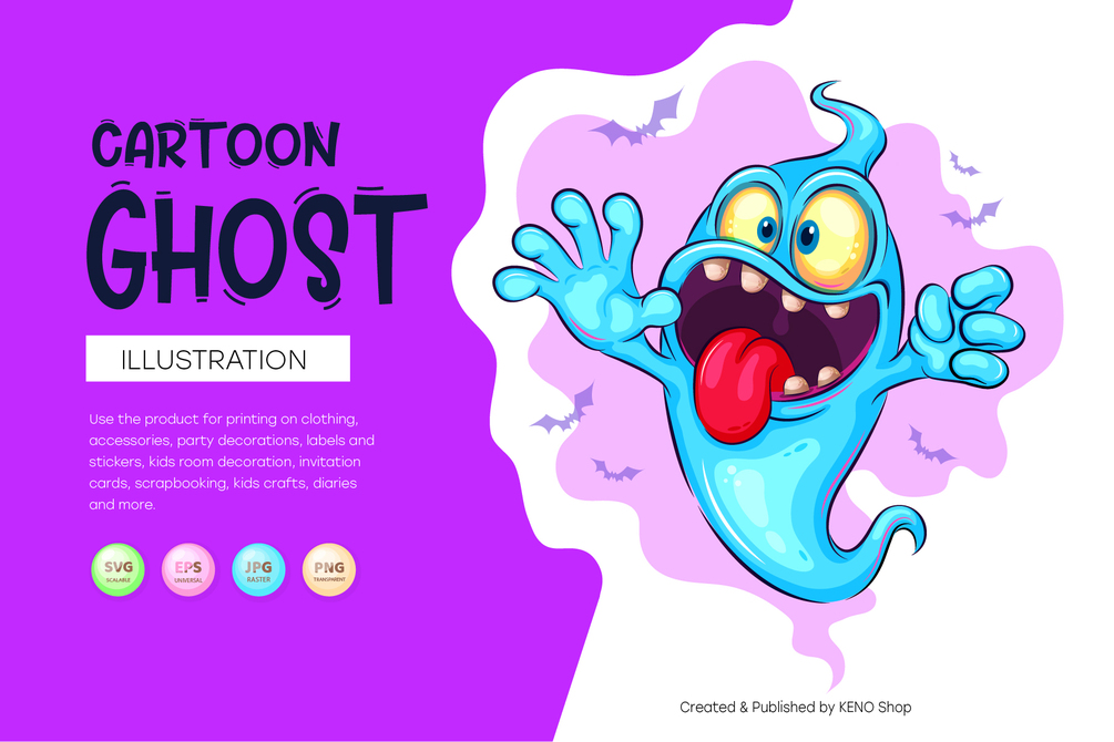Illustration of a cute ghost for the holiday Halloween. Unique design, Children's illustration. Use the product for printing on clothing, accessories, party decorations, labels and stickers, kids room decoration, invitation cards, scrapbooking, kids crafts, diaries and more.